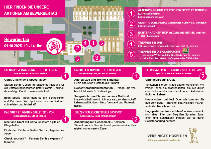 In der Cafeteria des Stift St. Irminen freuen sich die Mitarbeiterinnen der Personalverwaltung auf ein Gespräch mit Ihnen. Dort finden Sie ebenfalls die Ansprechpartner der Agentur für Arbeit sowie Mitarbeitende des Integrationsamtes. An den einzelnen Aktionspunkten stehen Ihnen die jeweiligen Einrichtungsleitungen unserer Einrichtungen sowie die Kollegen/innen und Auszubildenden sehr gerne für Ihre Fragen zur Verfügung.