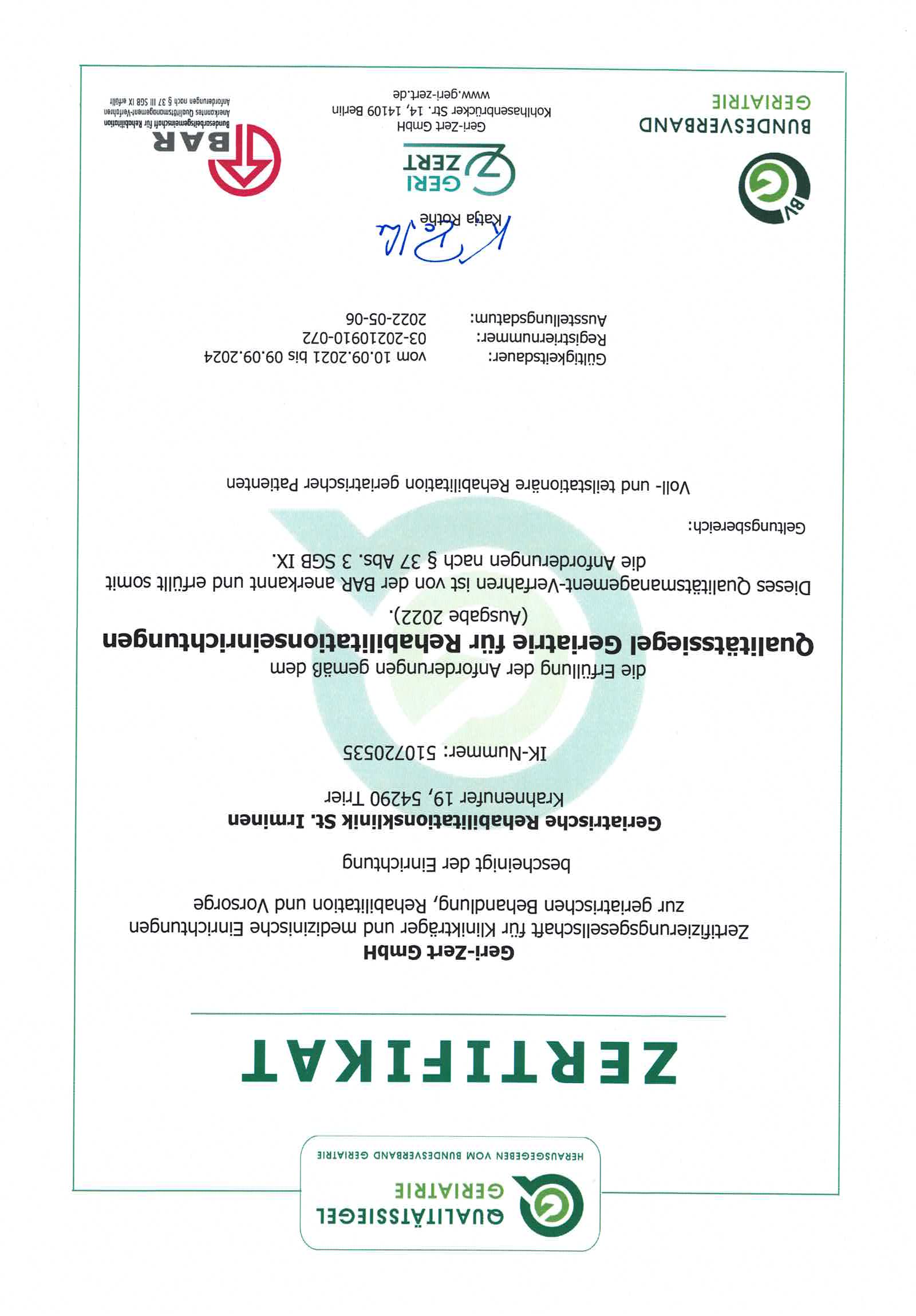 Die Geri-Zert GmbH Zertifizierungsgesellschaft hat der Geriatrischen Rehabilitationsklinik St. Irminen im Februar 2023 das Zertifikat "Qualitätssiegel Geriatrie" verliehen. Das Zertifikat bescheinigt die Erfüllung der Anforderungen gemäß dem Qualitätssiegel Geriatrie für Rehabilitationseinrichtungen. Dieses Qualitätsmanagementverfaren ist von der Bundesarbeitsgemeinschaft Rehabilitation e.V. (BAR) anerkannt und erfüllt somit die Anforderungen nach § 37 Abs. 3 SGB IX.